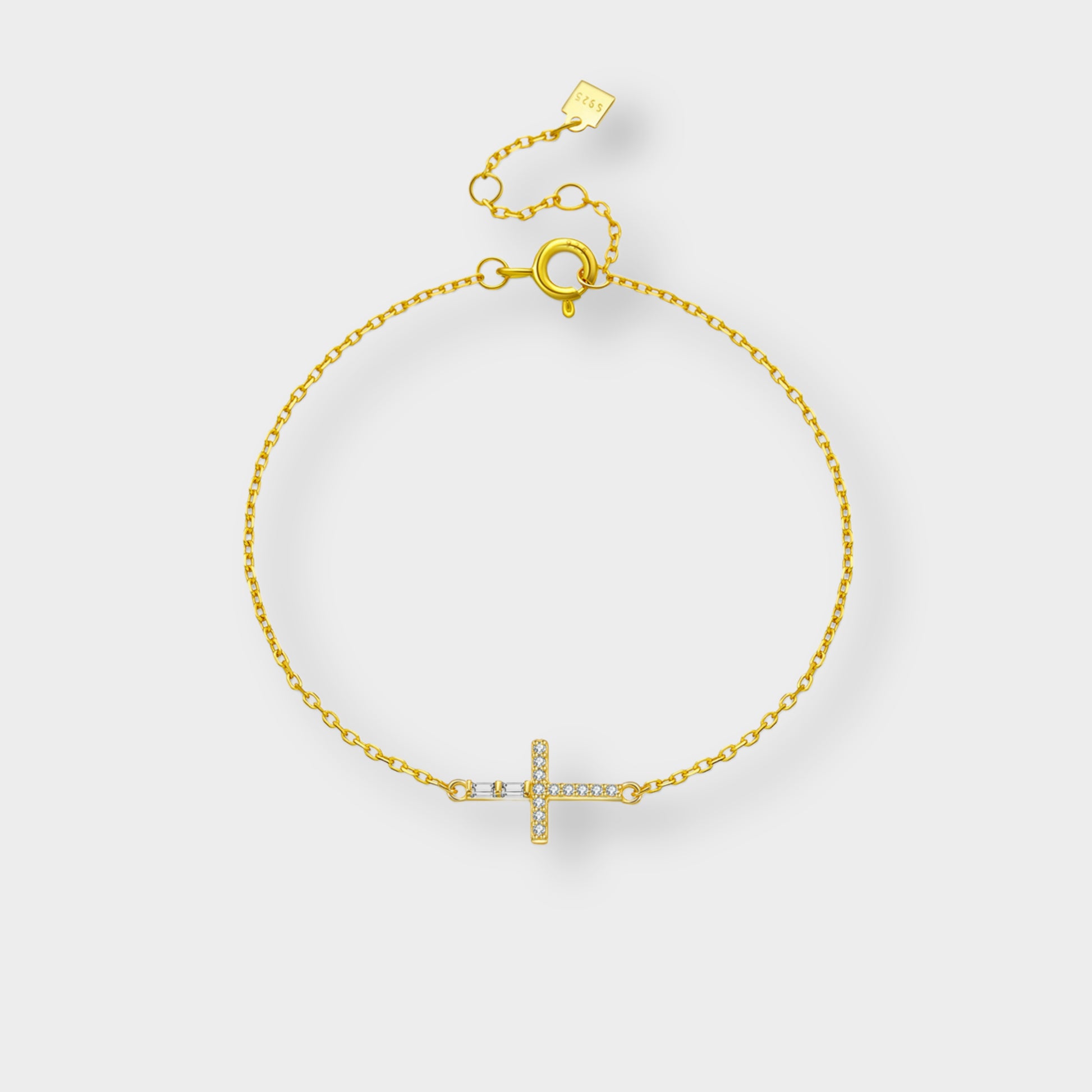 The Felmeny Tilted Cross Bracelet is a stylish and meaningful accessory. Crafted from high-quality sterling silver, it features a slightly angled cross adorned with a sparkling zircon stone. The polished finish and refined design make it perfect for everyday wear or special occasions, adding a subtle touch of elegance and sophistication to any ensemble.